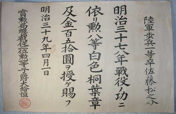 Meiji 37-8 [1904-05] campaign, the Emperor bestows the Eighth Class Order of
