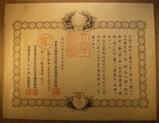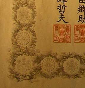 of the certificate, with the Imperial chrysanthemum in the centre.