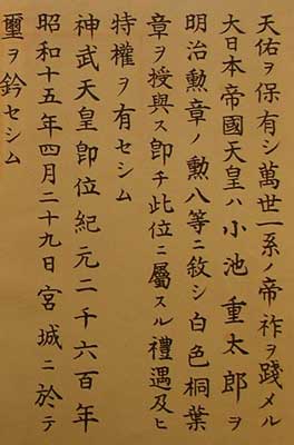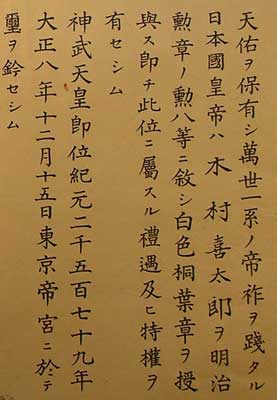 The right side has the important information, i.e. the recipient’s name and the date. The wording is slightly different from the earlier certificate shown above, so here is the whole thing, first in Japanese, then in English. The Japanese wording differs in the terms used for the Emperor and the Palace, but is otherwise pretty much the same.