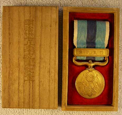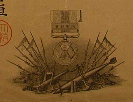 I was surprised by how rough the machining was on this medal. The bar has the four characters ju-gun-ki-sho. Read right to left, they mean “war medal”. The design shows two crossed flags with a chrysanthemum above and paulownia leaves below. The chrysanthemum and paulownia are both symbols of the Imperial family. This medal is covered on page 46 of OMJAS.