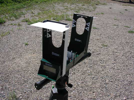 Here is my chronograph set up on my Cullman photographic tripod. The table I shot from is in the foreground and the 25 yard target frames are in the background.