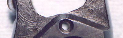 This is the bottom left side of the grip frame, showing two gMh inspection markings, one on either side of the screw hole.