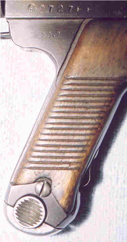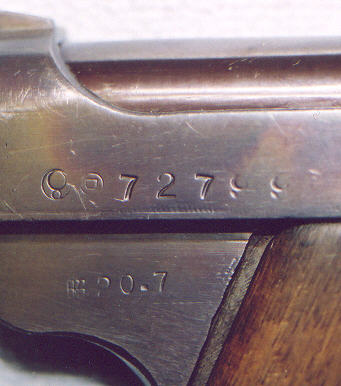 This close-up shows the markings. Usually last ditch pistols show a lot of exterior machining marks. Looking at the serial number here and how the edges of the numbers seem very smooth made me think the exterior of the frame had been polished and re-blued, but I have consulted a leading expert and he says that the finish on last-ditch guns (20.7 & 20.8) was highly variable and some were buffed in this way, so it is probably original.