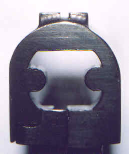This is the rear sight. Note how it has been simplified from the earlier type, which had gpincersh at the top instead of a simple notch. I think this was typical of Toriimatsu pistols.