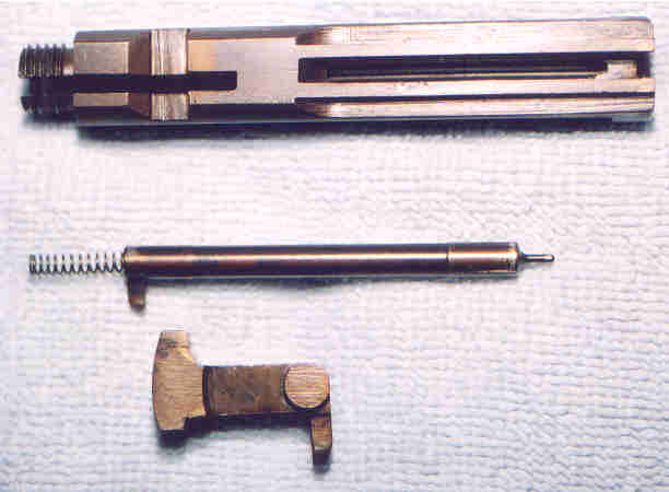 The bolt (bottom shown), firing pin and locking block have a weird gbluingh with a coppery red cast to it. The firing pin is the 73 mm variety rather than the standard 65 mm that Toriimatsu used, and the bolt and firing pin extension are designed to match it. It is said to have been common for these last ditch pistols to use a variety of different parts from different factories as old inventory was put to use to overcome shortages and keep production going.