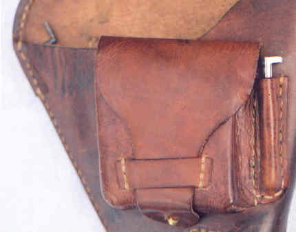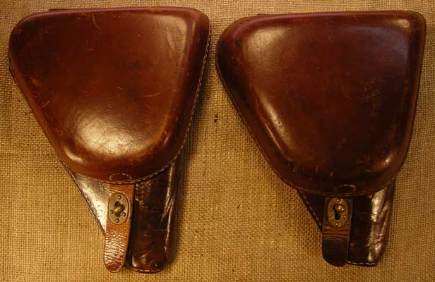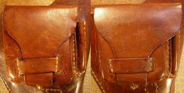 Here is a side-by-side comparison photo so you can see the difference. The left side shows the early holster with a narrow ammo pouch flap that covers only the ammo pouch. The right side shows the later holster with the wider ammo pouch flap that covers the spare striker pocket as well. I just learned how to combine two photos into one like this.