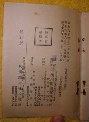 of the War Ministry. The columns below the box begin on the right with honkoku (or hankoku) hakkosha, or the publisher of the reprint. The column of
