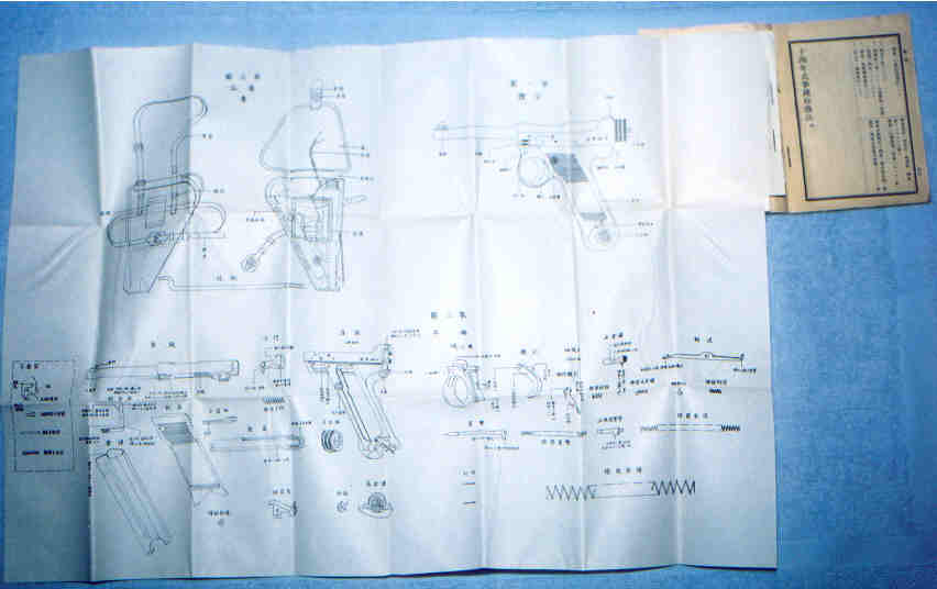 This is the big foldout in the back. In this version of the reprint all the diagrams are squeezed onto two big foldouts, whereas my original has several separate ones. The Derby & Brown book does show a special instruction sheet that had all the diagrams squeezed together like this, though (p. 186). In August, 2009 I saw one of these manuals being offered for sale at a gun show in Puyallup, Washington (near Seattle). That one had the publishing information page still in the back (that page had been ripped out of mine). The page indicated the manual was printed in Showa 38 (1963). That definitively established that this version is a reprint, and also explains why it is hard to tell: it has had over 40 years to age, and you have to be pretty sharp to tell the difference between something that is 40 years old and 70 years old.