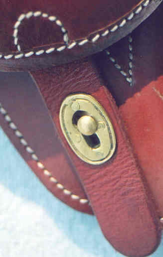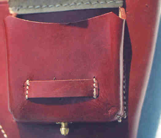 Here it is opened to show the ammo pouch. As you can see there is no slot for the firing pin (it would be to the right of the ammo pouch). The item seems to reproduce a fairly early model, which did not have the firing pin slot and had a different closure than the holster above (see below). If you look closely at where the clamshell attaches to the body you can see that it was glued as well as sewn. Originals were just sewn.